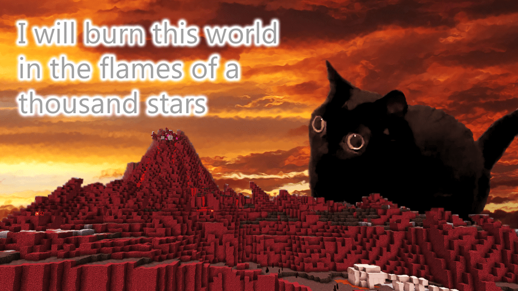 For the comical composite, my vision was to have an adorable critter overlooking a hellish environment with villanous text. I started by establishing the background of a Minecraft volcano (also from my Minecraft build), removing the blue sky and replacing it with warm clouds. I added an adjustment layer to the volcano to emphasize the red. I then added my critter of choice by removing the background of its picture and smoothing her rough edges with the blur tool. I then added text with a menacing line and a glow effect to make it appear that the cat was speaking. I finished off by applying a glassy filter on everything to give the appearence of heat waves.