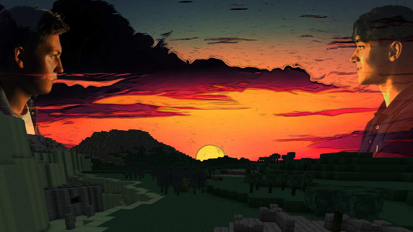 After that assignment was complete, I was then tasked with making two composite images using photoshop. I wanted the first one to be comical and the second one to be serious. For the serious composite, I used two profile shots I had saved from the previous assignment. My vision was to have them both facing each other in a sunset background. To pull this off in photoshop, I took a picture of my Minecraft build (see here), added an exposure adjustment layer to make it appear darker, and replaced the blue sky with a sunset. I then removed the backgrounds from the two profile shots I had saved, and lowered their opacity values.